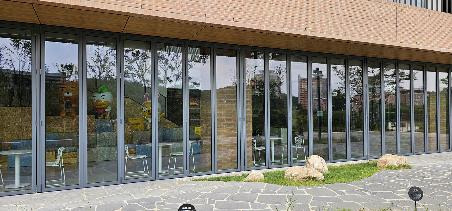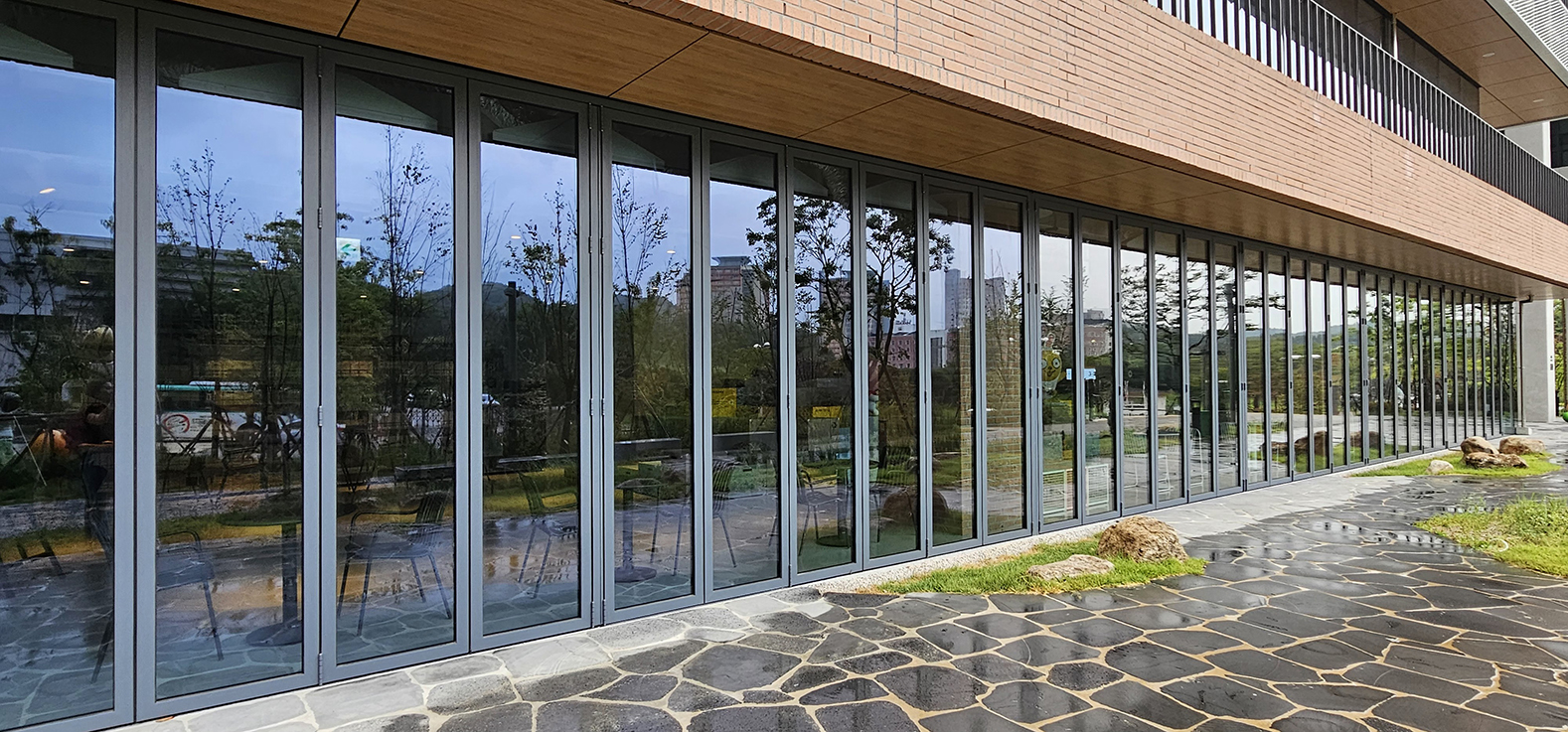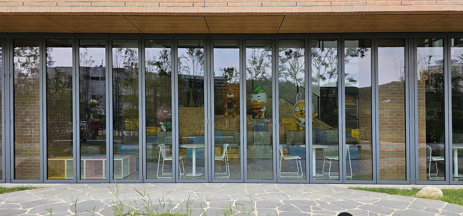 한양대 에리카 캠퍼스 내에 착공된 카카오 데이터 센터입니다. 올해 새로 신축된 건물로 데이터 센터 1층 전면에 지정색상의 단열폴딩도어를 설치하였습니다. 건물과 잘 어울리는 지정색상 컬러가 세련된 느낌을 주며 단열폴딩도어를 설치하여 건물 내의 단열까지 생각하였습니다. 1~2층은 상시 개방되는 공간으로 카카오 캐릭터를 볼 수 있으며 일반인들도 출입이 가능한 휴게공간으로 꾸며져 있습니다.