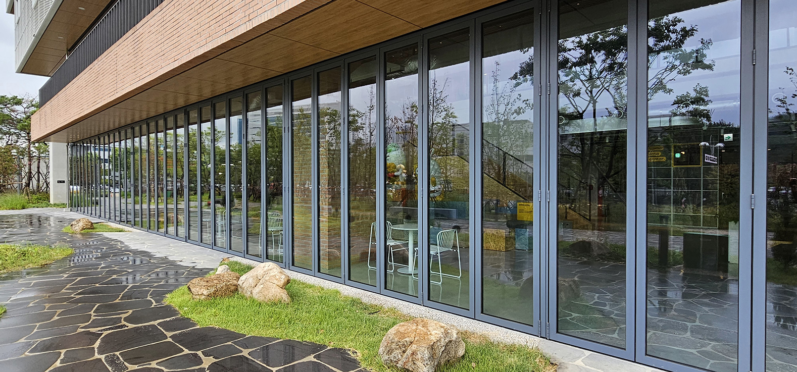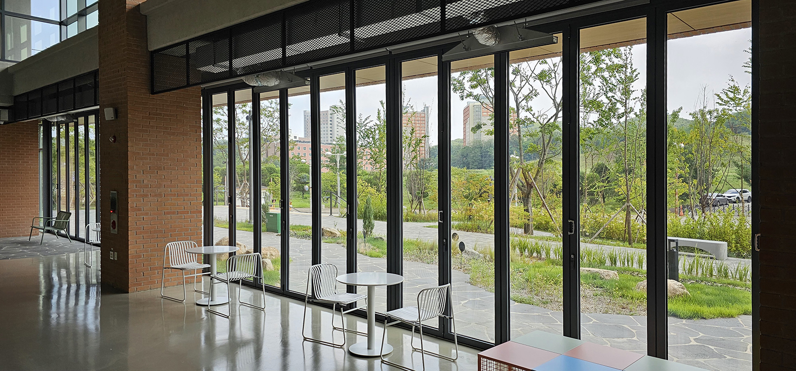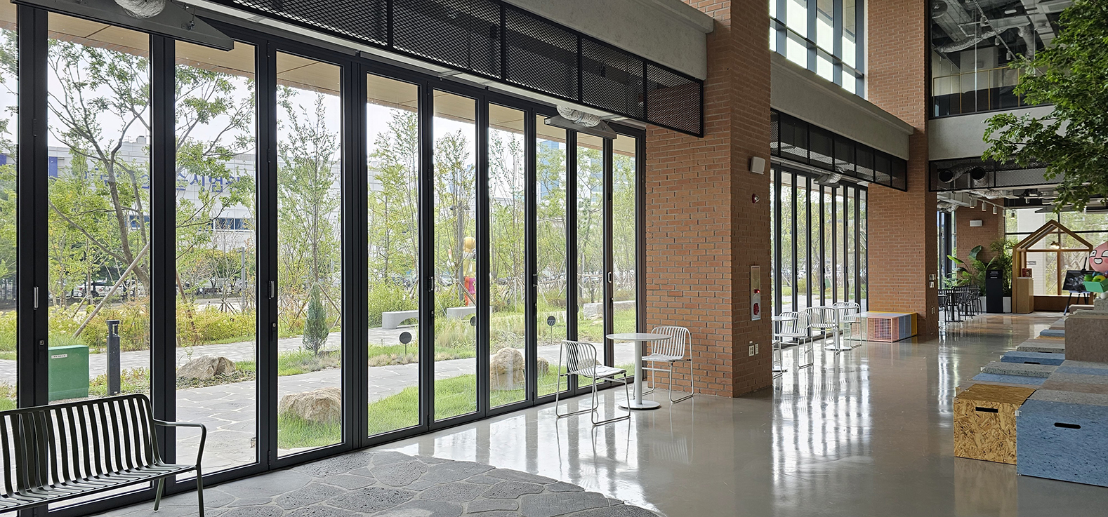 한양대 에리카 캠퍼스 내에 착공된 카카오 데이터 센터입니다. 올해 새로 신축된 건물로 데이터 센터 1층 전면에 지정색상의 단열폴딩도어를 설치하였습니다. 건물과 잘 어울리는 지정색상 컬러가 세련된 느낌을 주며 단열폴딩도어를 설치하여 건물 내의 단열까지 생각하였습니다. 1~2층은 상시 개방되는 공간으로 카카오 캐릭터를 볼 수 있으며 일반인들도 출입이 가능한 휴게공간으로 꾸며져 있습니다.