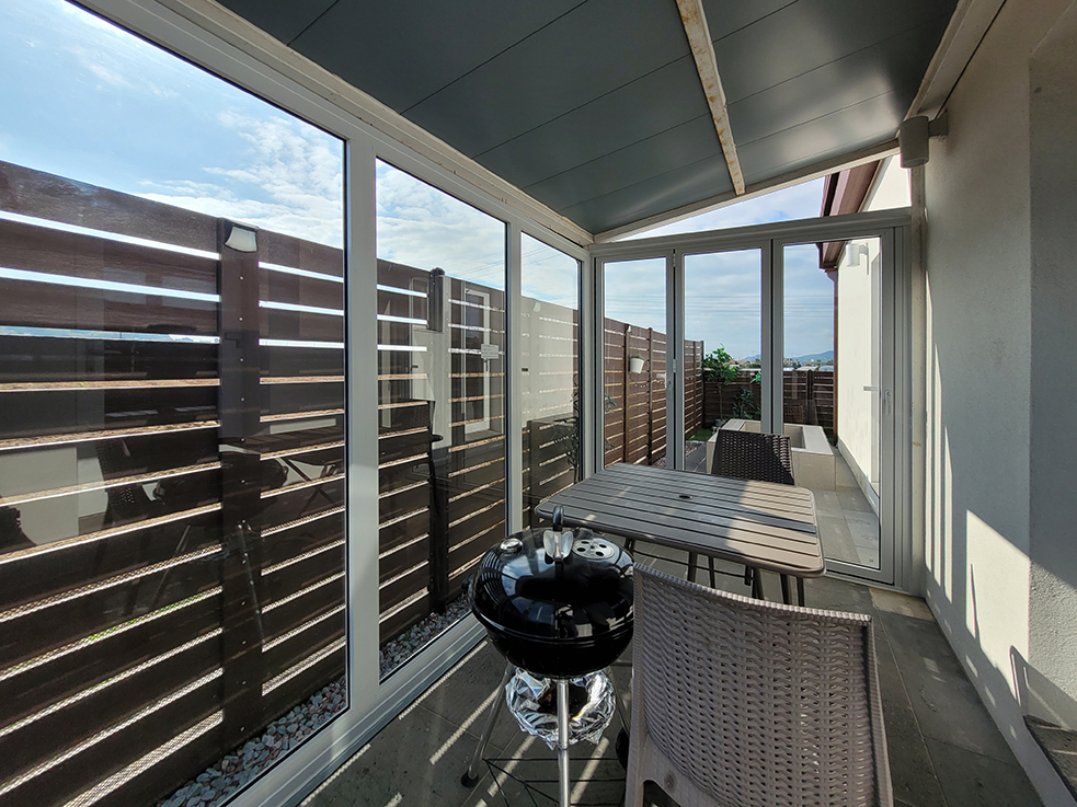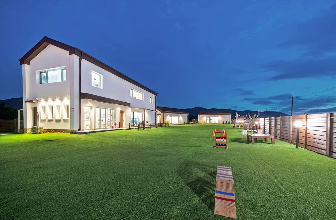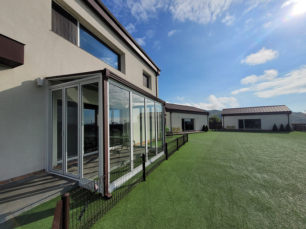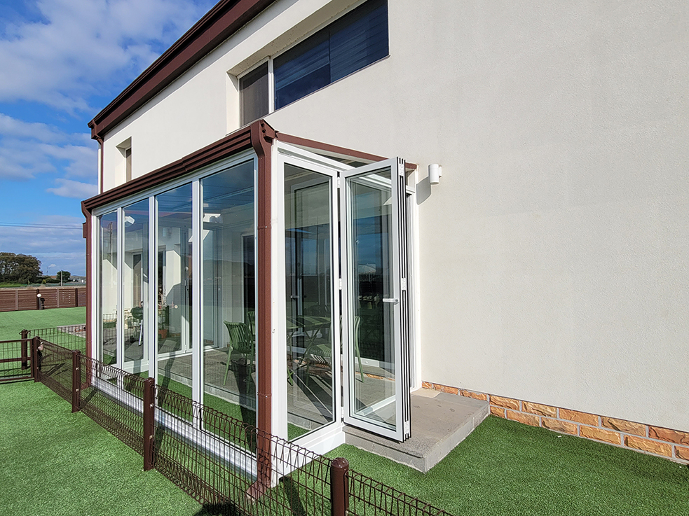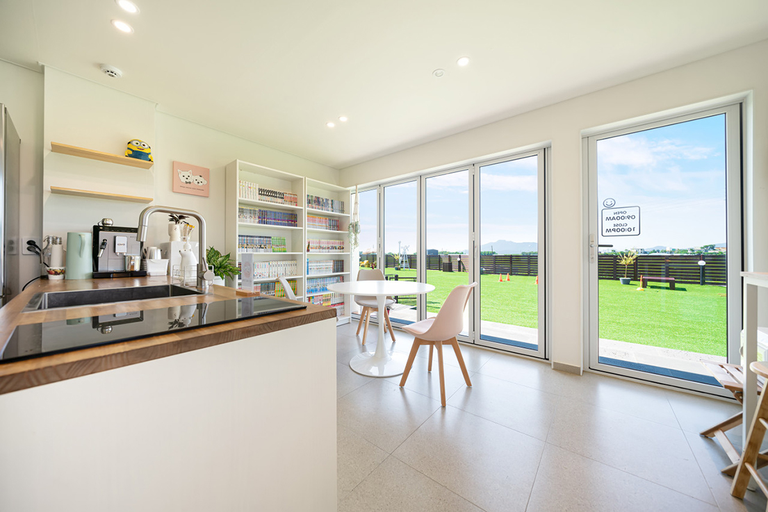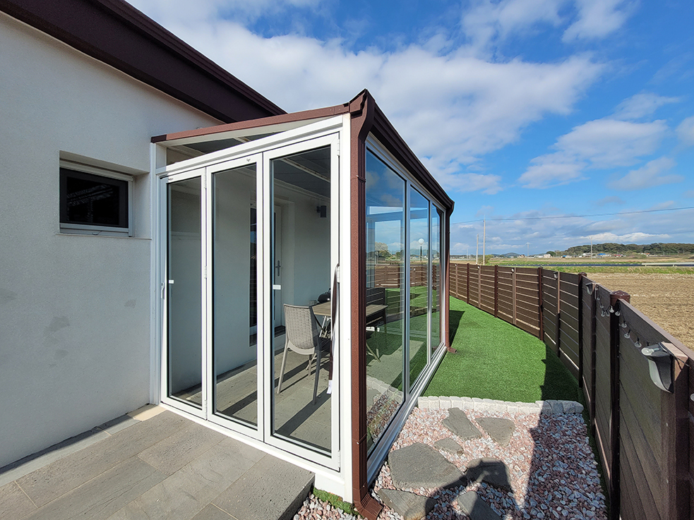 이 중 독채 룸에 위치한 카페와 바비큐 존은 비가 오거나 추운 겨울에는 이용하기 어려운 문제가 있었는데, 이를 해결하기 위해 폴딩도어를 설치하였습니다. 이제 계절에 관계없이 폴딩도어를 통해 실내외를 유연하게 연결할 수 있게 되어, 사계절 내내 편안하게 카페와 바비큐 존을 독립적으로 이용할 수 있게 되었습니다.