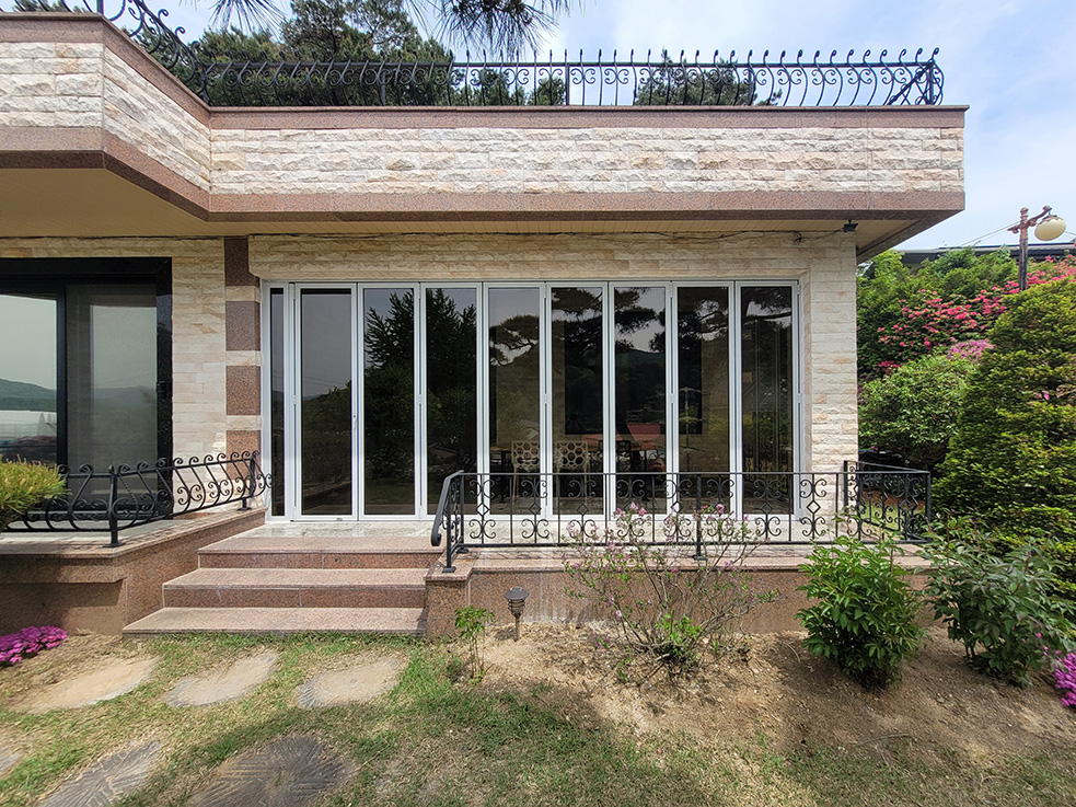 양평 문호리에 위치한 단독주택은 기존에 현관 앞 공간에 도어가 없어 외부인의 출입과 보안 문제, 단열 부족, 바람에 의한 먼지와 벌레 유입 등 여러 불편함이 있었습니다. 이를 해결하기 위해 정면과 측면에 화이트 컬러 폴딩도어를 각각 8장과 3장 설치하였습니다.