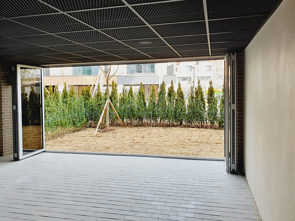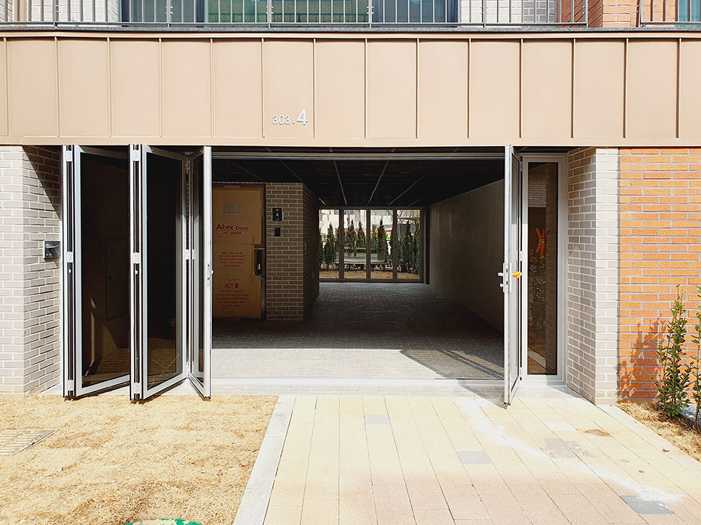 이 타운하우스는 1~2층의 단독주택이 여러 가구씩 모여 정원과 담을 공유하는 형태로, 이웃 간의 거리가 가까워 완전한 프라이버시를 보장하기 어려운 구조입니다. 이에 따라 폴딩도어를 설치하여 실내외 공간을 효율적으로 나누고, 프라이버시 보호와 공간 활용도를 높였습니다.
