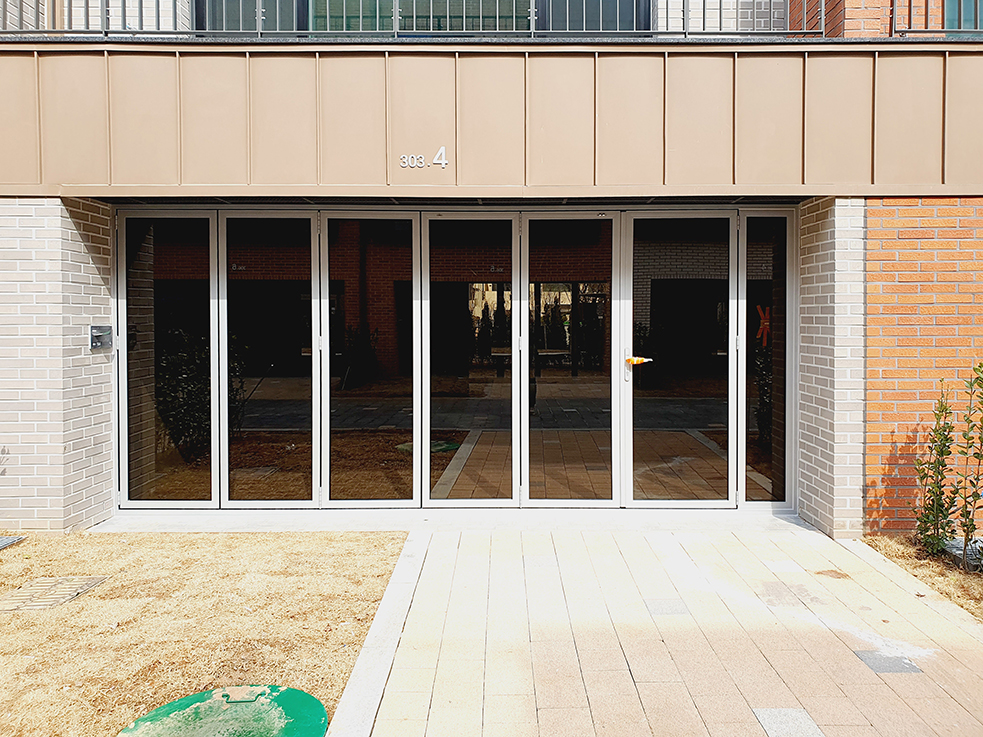 정원 쪽에는 22T 브론즈 유리와 투명 유리가 결합된 블랙컬러 폴딩도어를 8장, 현관 쪽에는 5장을 설치하였는데, 브론즈 유리 덕분에 외부에서 내부가 잘 보이지 않아 프라이버시가 잘 보장됩니다. 또한, 외부인의 출입을 제한하고 물건의 도난 및 분실을 방지할 수 있어 안전성도 강화되었습니다.