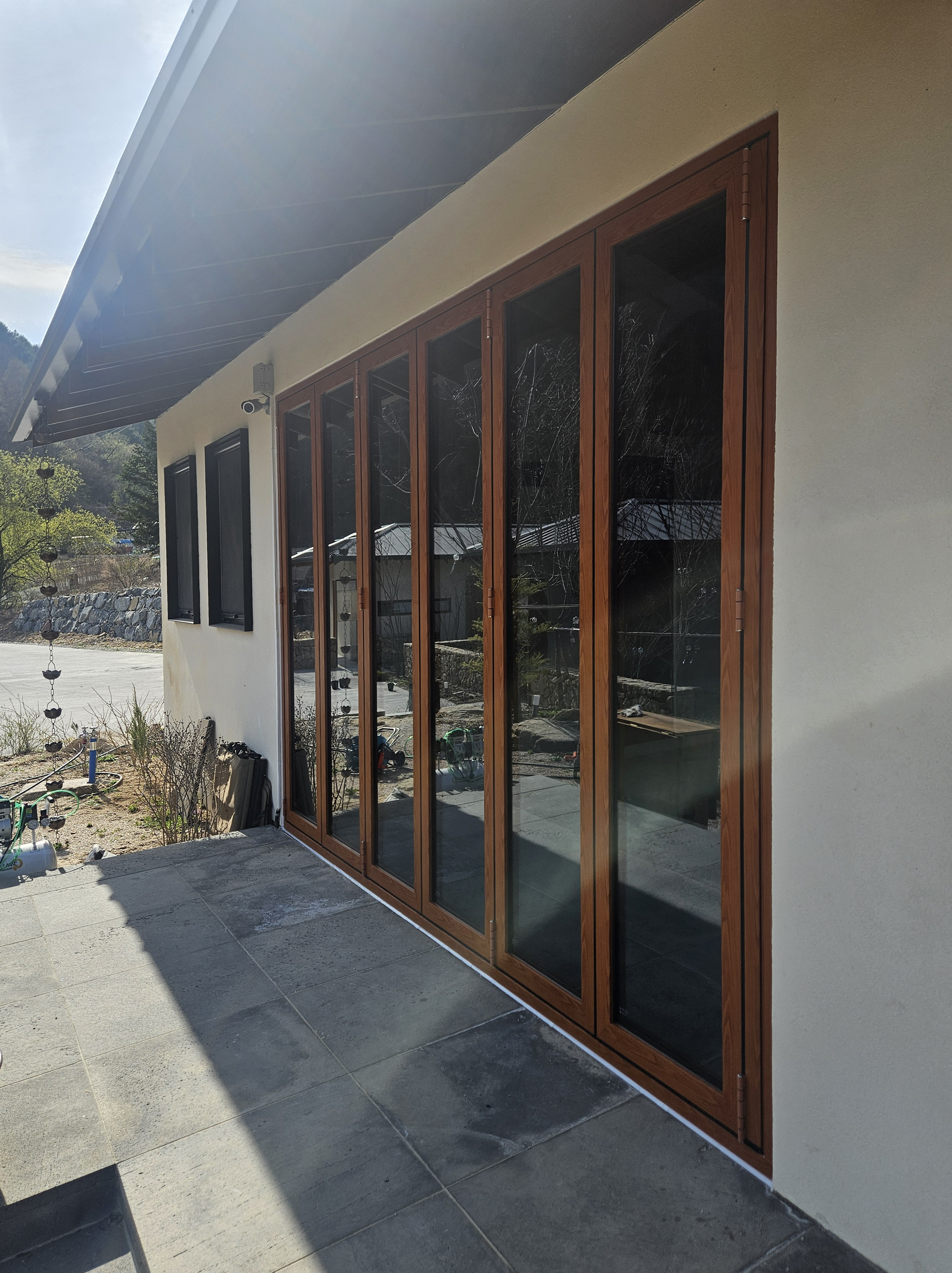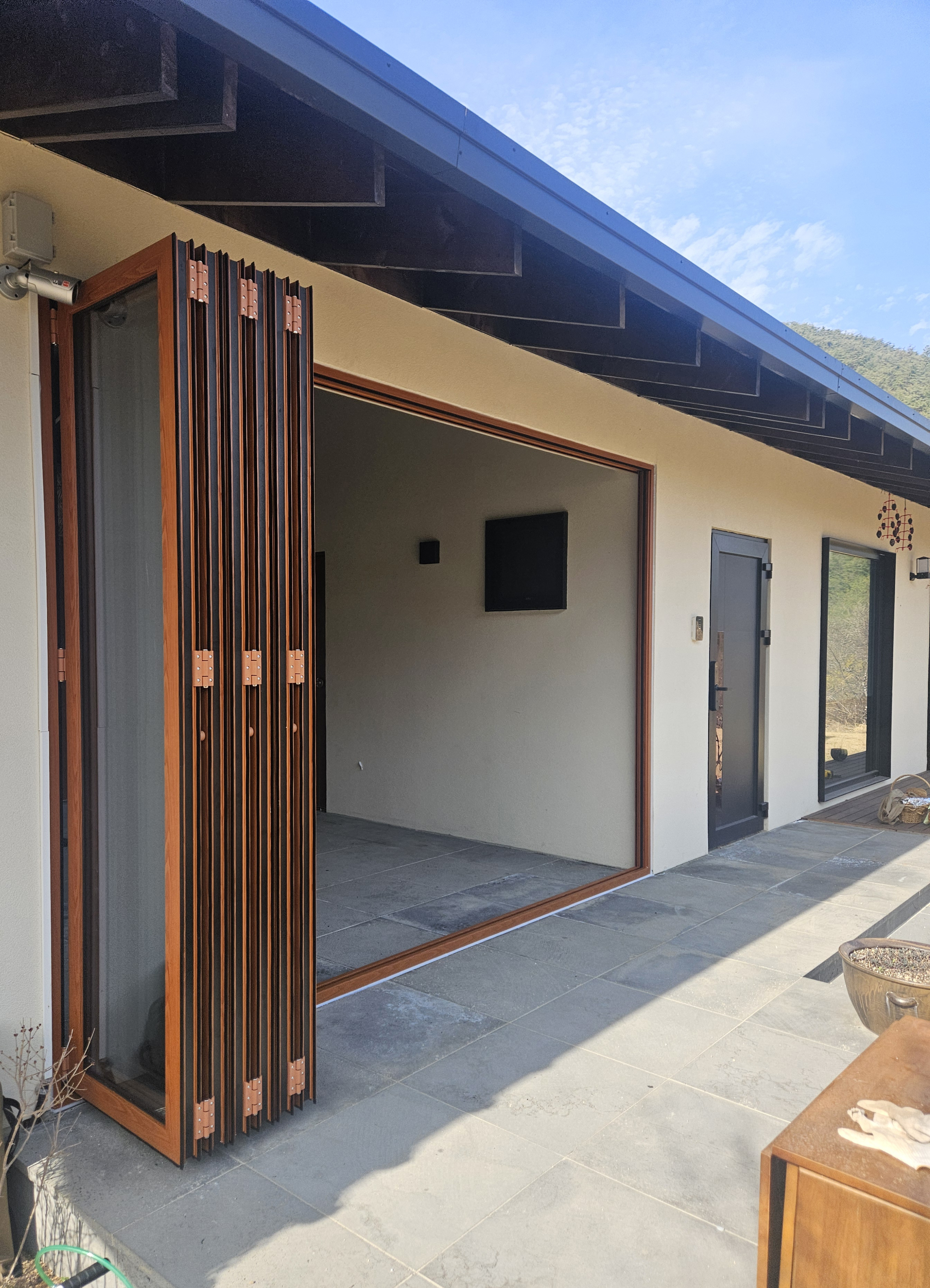 영월은 겨울에 매우 추운 지역으로, 산골짜기에 위치한 펜션에서의 단열은 매우 중요한 요소입니다. 이에 따라 폴젠코리아의 단열폴딩도어를 설치하여, 높은 열관류율과 기밀성 덕분에 겨울에도 따뜻한 실내온도를 유지할 수 있습니다.