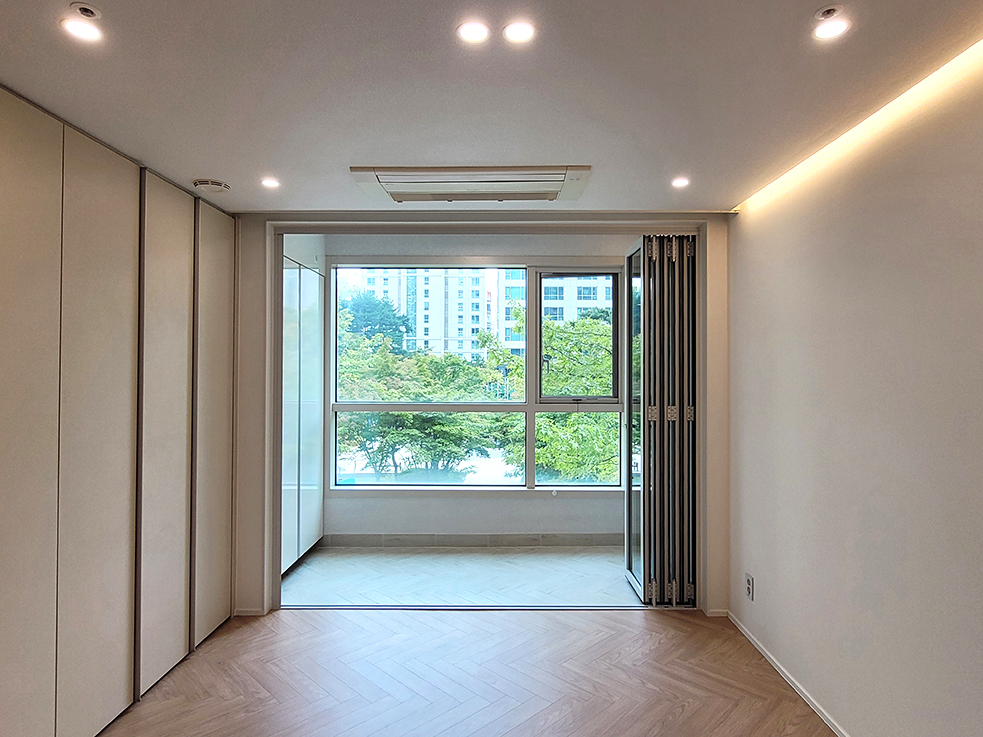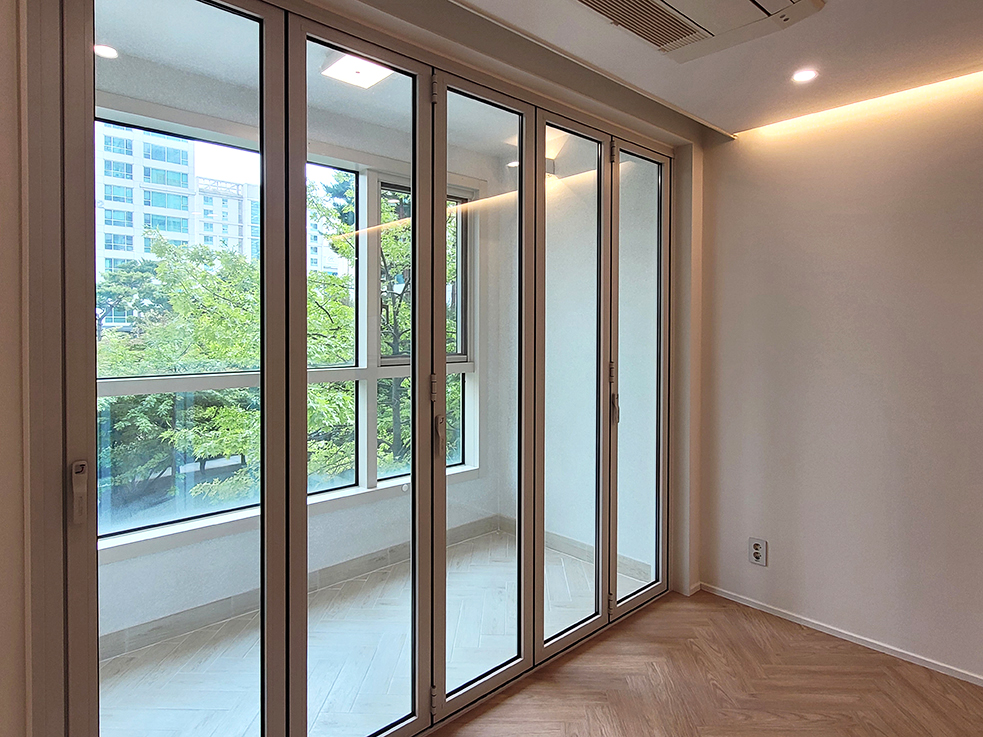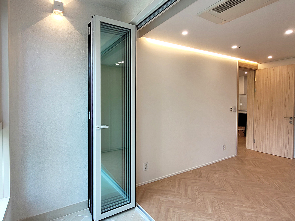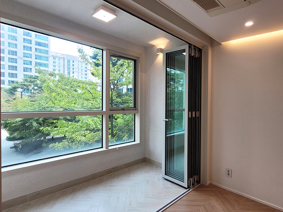 안방 베란다에 기존 중문을 떼어내고 확장 대신 폴딩도어를 설치하여 개방감과 공간감을 높였습니다.
