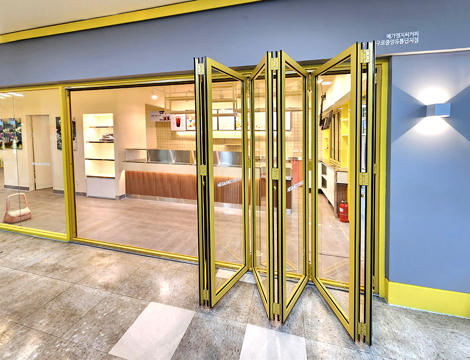 구로 유통단지에 새롭게 오픈한 프랜차이즈 메가커피 신규 매장에 폴젠코리아의 폴딩도어를 설치하였습니다. 매장 내부의 전면에 메가커피의 메인 상징 컬러인 옐로우 컬러를 바탕으로 폴딩도어를 설치하였으며, 픽업 공간의 창문에도 창문형 폴딩도어를 설치하여 매장과 외부의 원활한 연결을 도왔습니다.