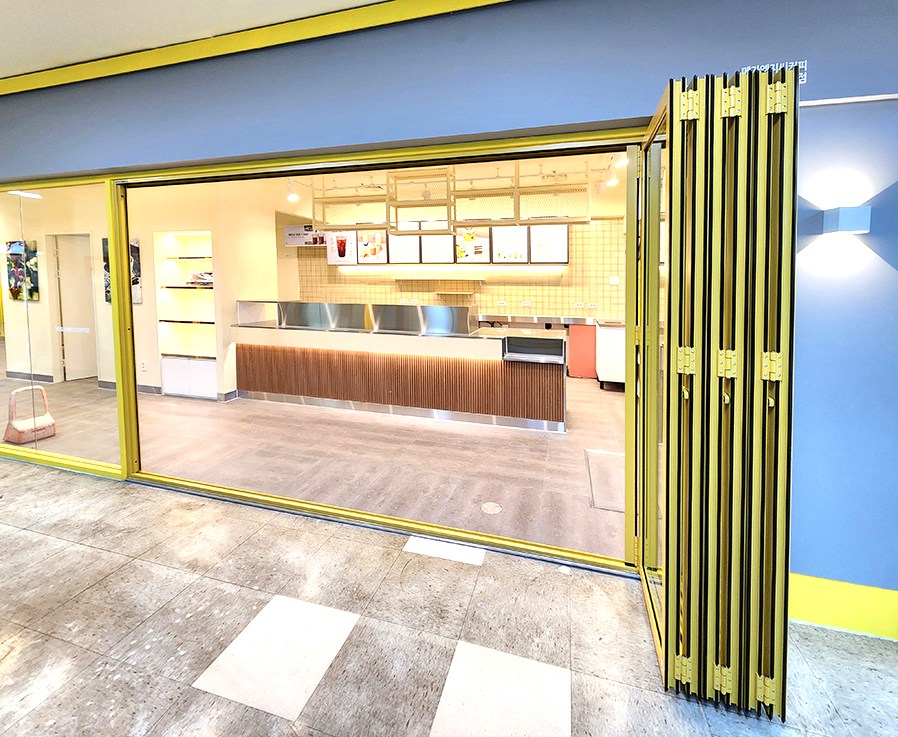 매장 전면에 설치된 폴딩도어는 평상시 열어두어 외부와의 연장선으로 넓은 공간을 사용할 수 있게 해줍니다. 또한, 매장의 옆면 창문에는 창문형 폴딩도어를 설치하여 고객들이 주문과 테이크아웃을 더욱 편리하게 할 수 있도록 동선이 고려되었습니다.