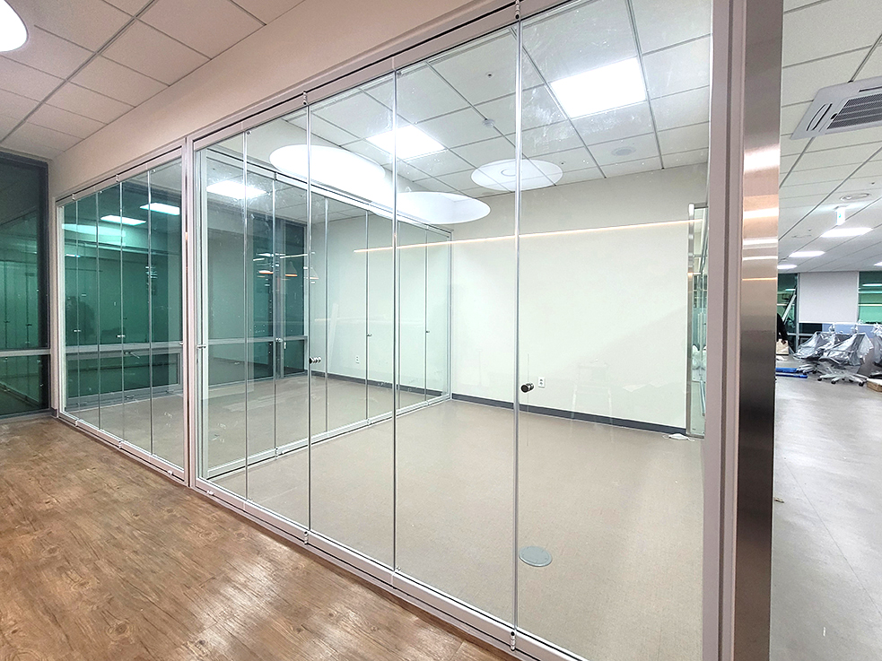 이 도어는 세로 프레임이 없어 깔끔하고 세련된 느낌을 주며, 전면 개폐가 가능해 공간을 효율적으로 활용할 수 있습니다. 또한, 불투명한 유리나 도어와 달리 내부가 보이면서도 공간을 분리할 수 있어 사무공간에 매우 적합한 제품입니다.