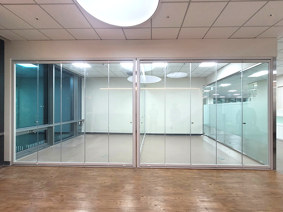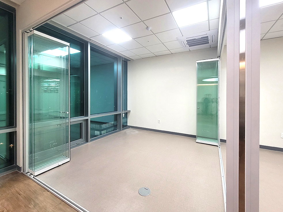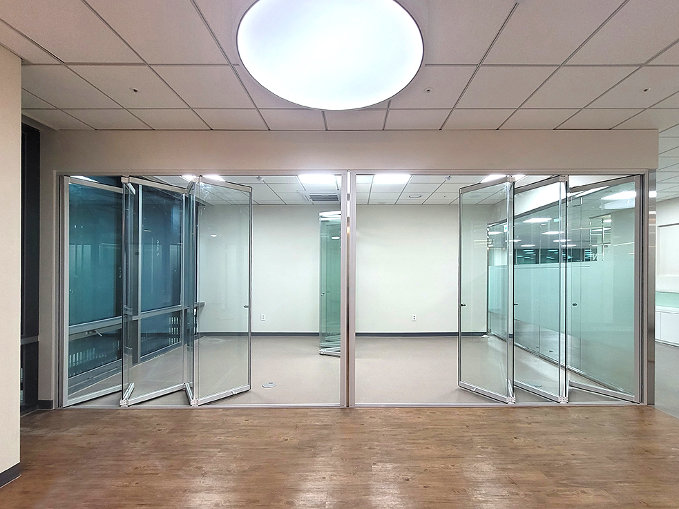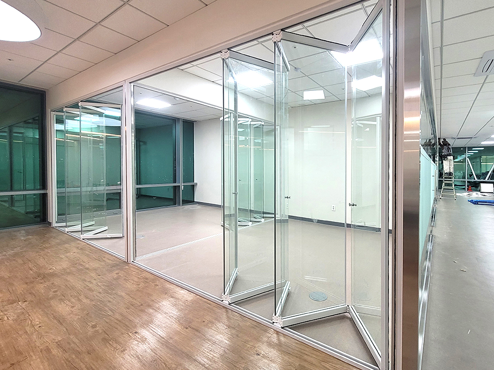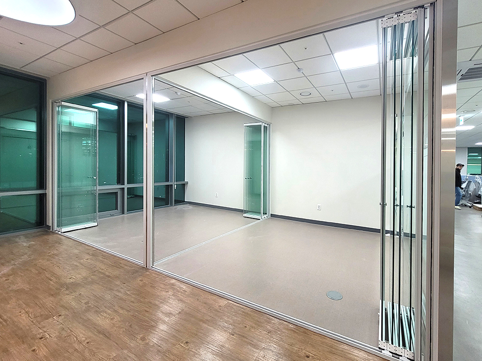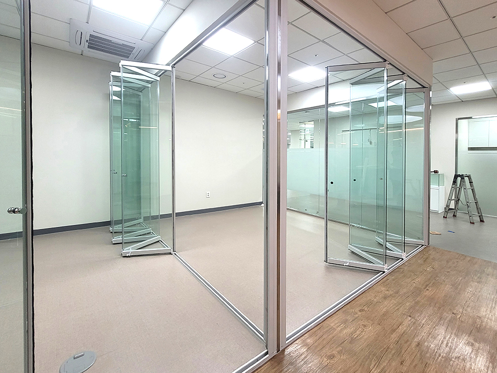리모델링 중인 사무실에 폴젠코리아의 글라스폴딩도어를 설치하였습니다. 글라스폴딩도어는 강화유리로 이루어진 접이식 문으로, 일반적인 폴딩도어와 달리 양쪽에 바가 없고, 문을 하나만 움직여도 모든 문이 연동되어 개폐되는 연동형 개폐 시스템을 자랑합니다.