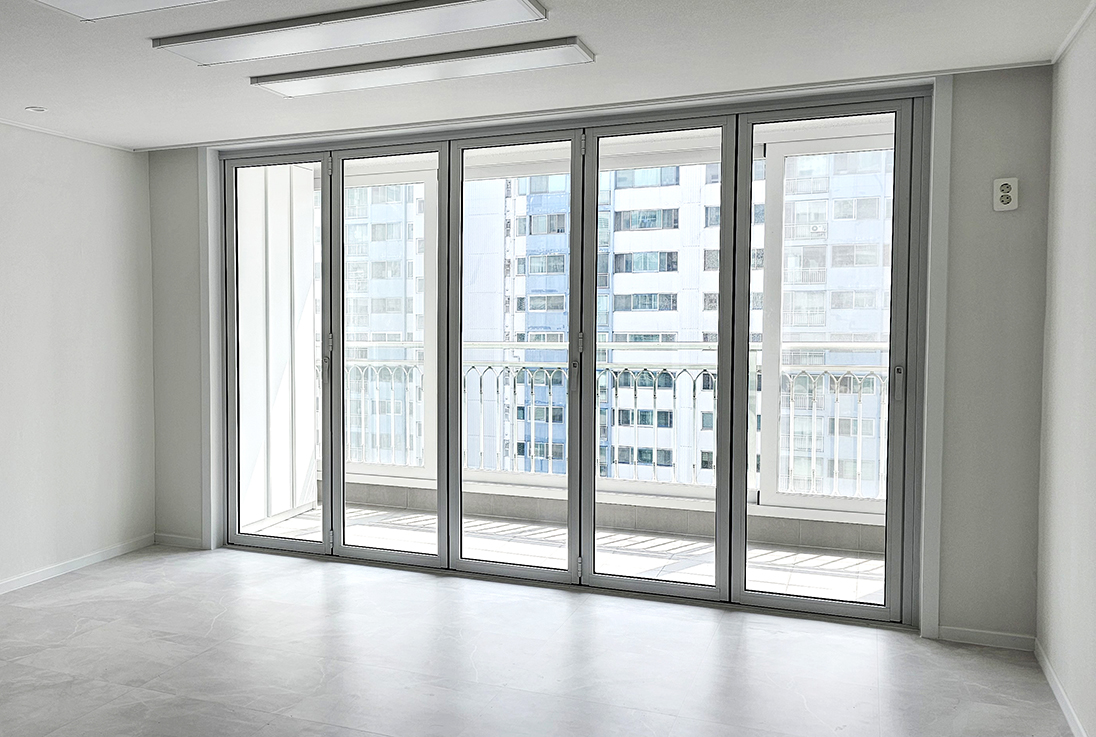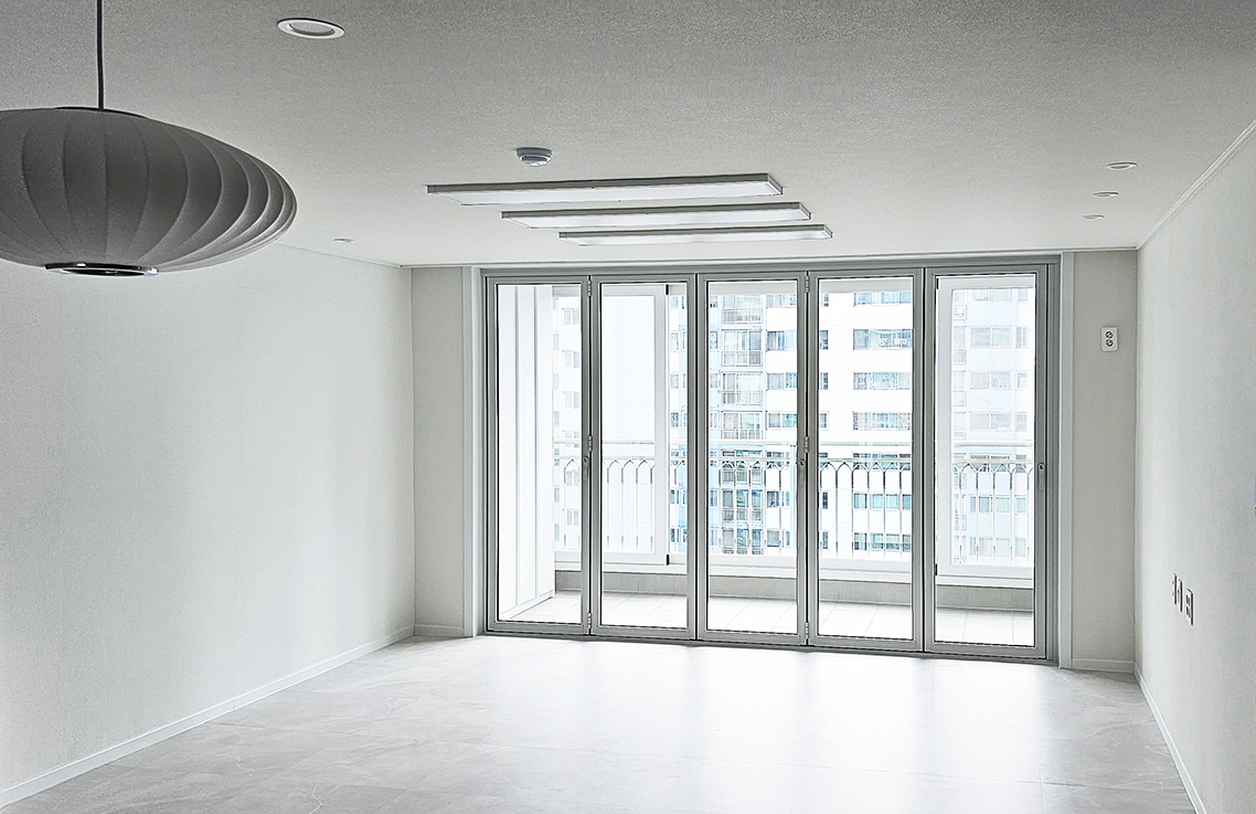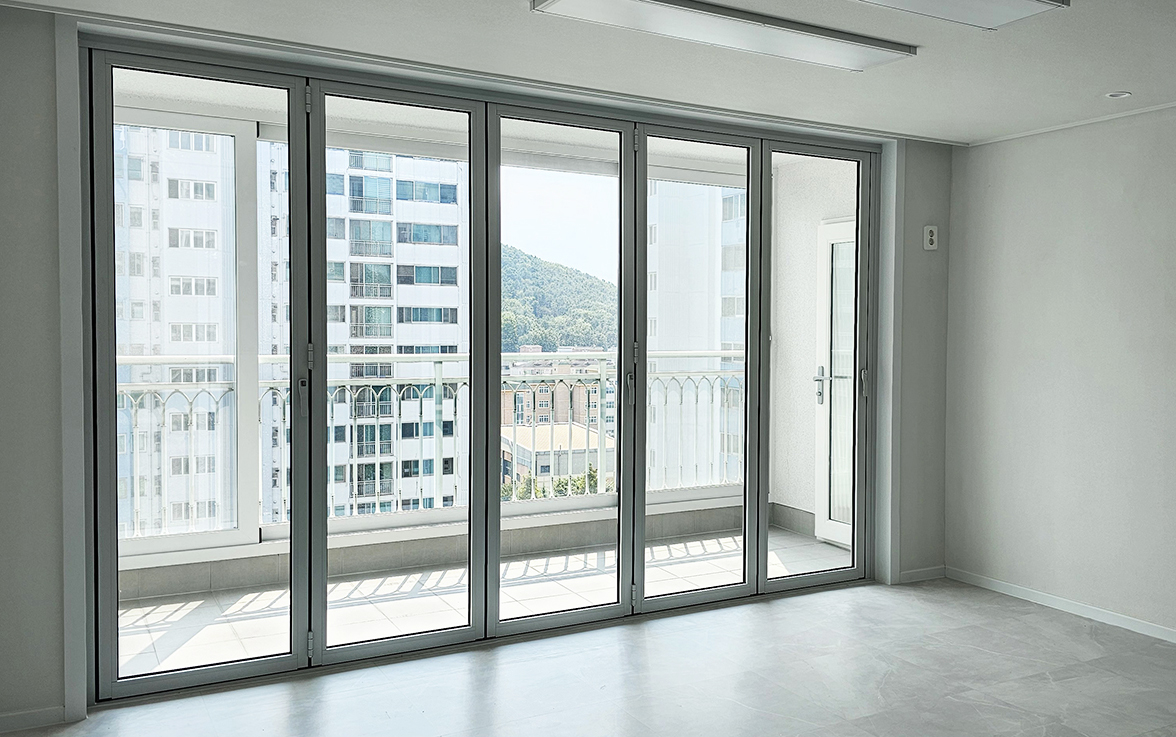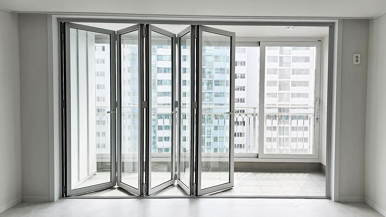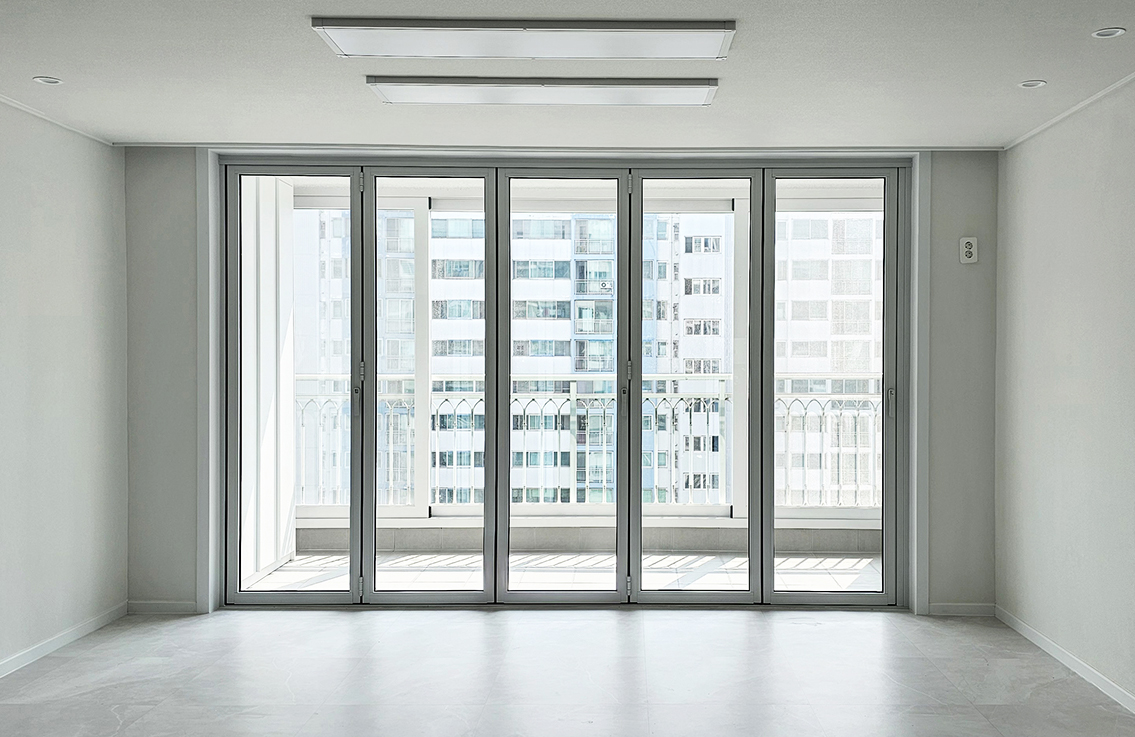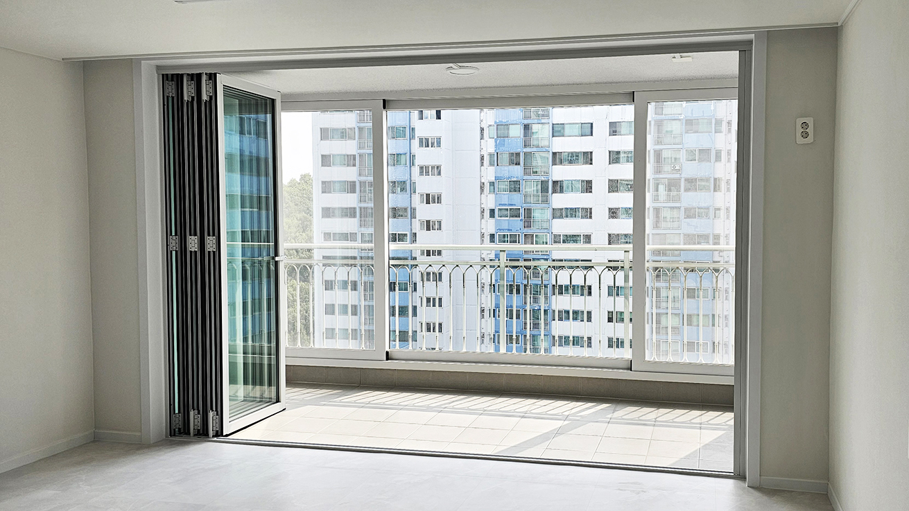 확장 대신 폴딩도어를 설치하여, 공간을 넓게 활용하면서도 실내 온도를 그대로 유지하고 확장된 개방감을 느낄 수 있도록 했습니다. 이처럼 폴딩도어는 실용성과 미관을 모두 만족시킬 수 있어 리모델링된 아파트에 완벽하게 어울립니다.
