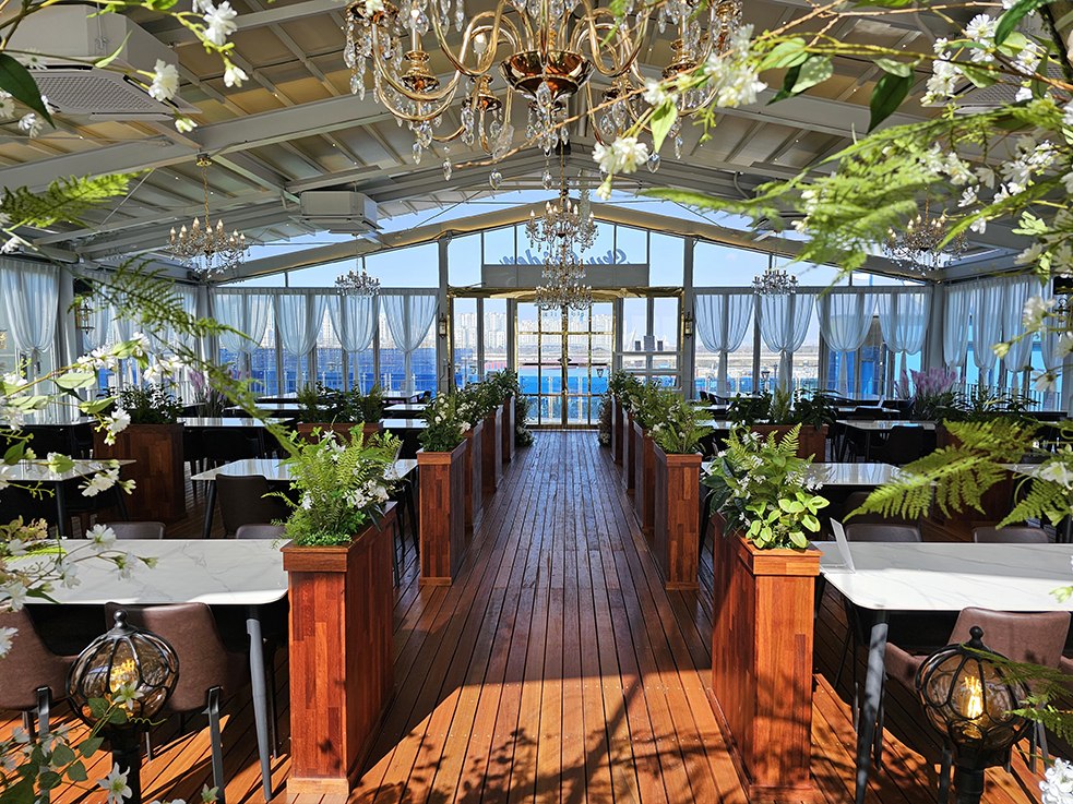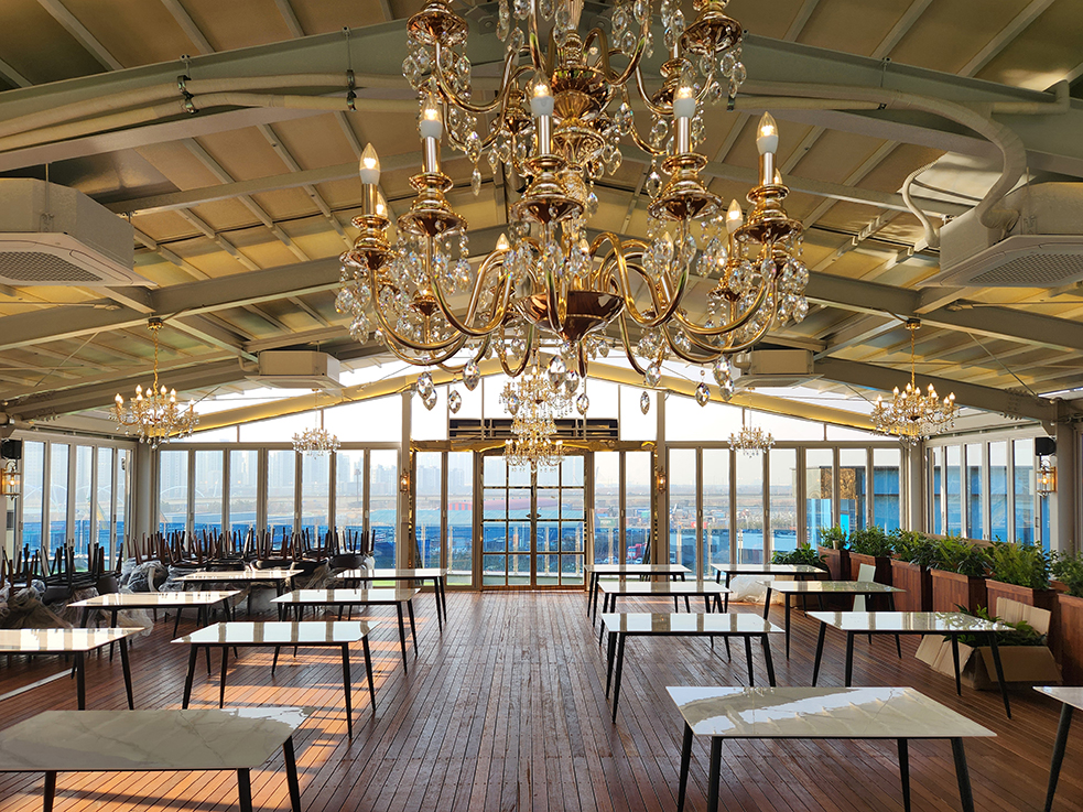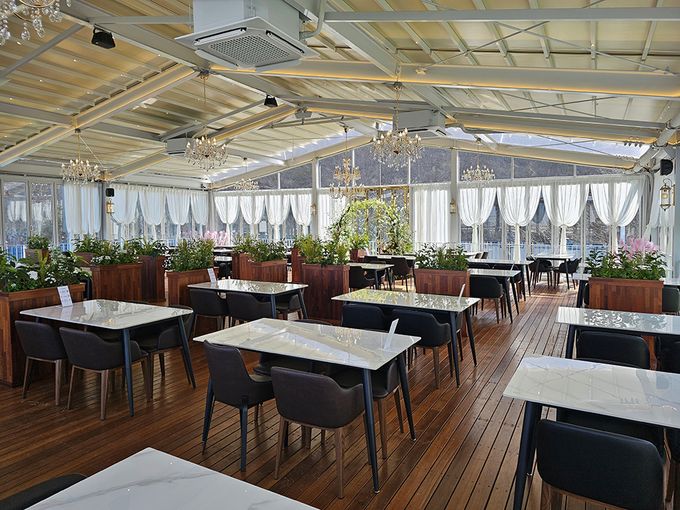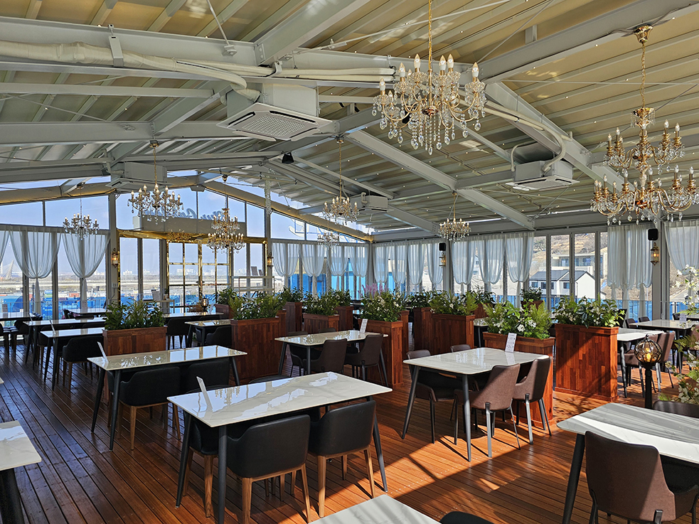 폴딩도어를 완전히 오픈하면, 카페는 야외와 실내의 경계를 허물고 자연의 풍경을 그대로 담을 수 있어, 손님들에게 시원한 바람과 멋진 전망을 만끽할 수 있는 공간이 됩니다. 마치 해외 리조트에 와 있는 듯한 느낌을 선사하며, 레스토랑과 카페의 고유한 분위기와 웅장한 외관은 이곳을 찾는 이들에게 특별한 경험을 제공합니다.