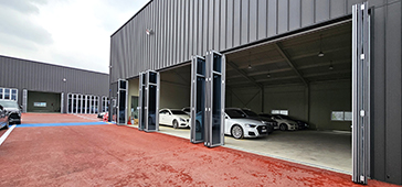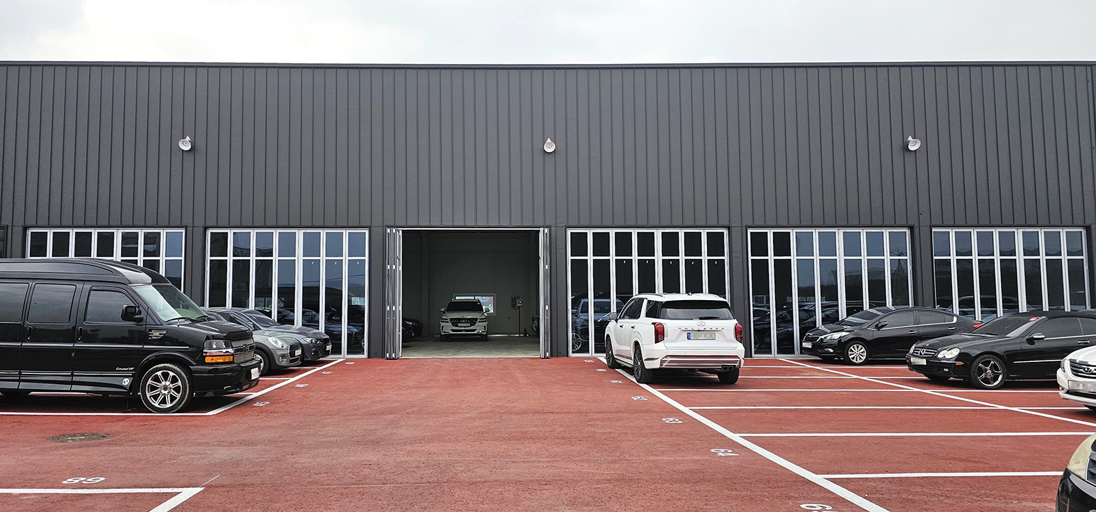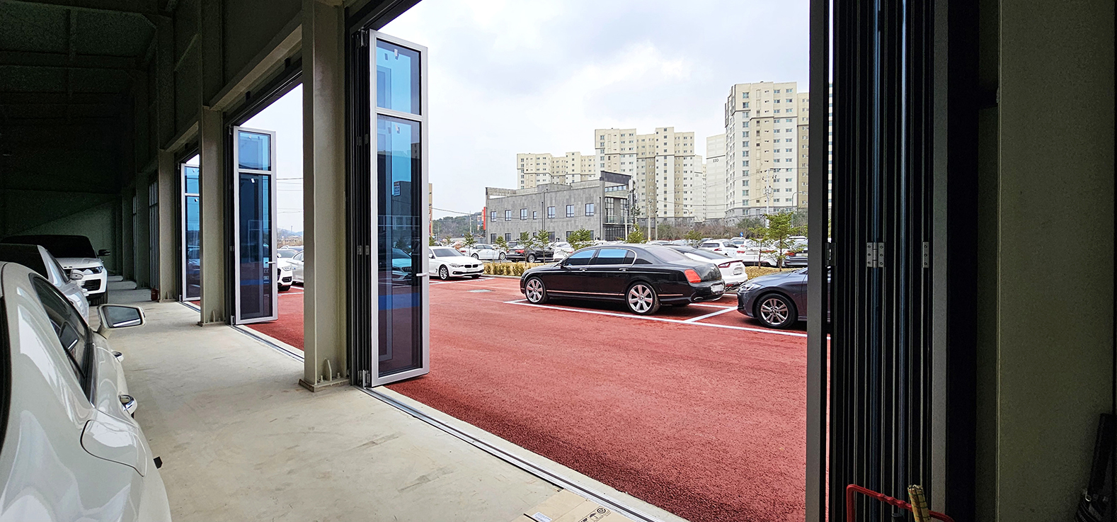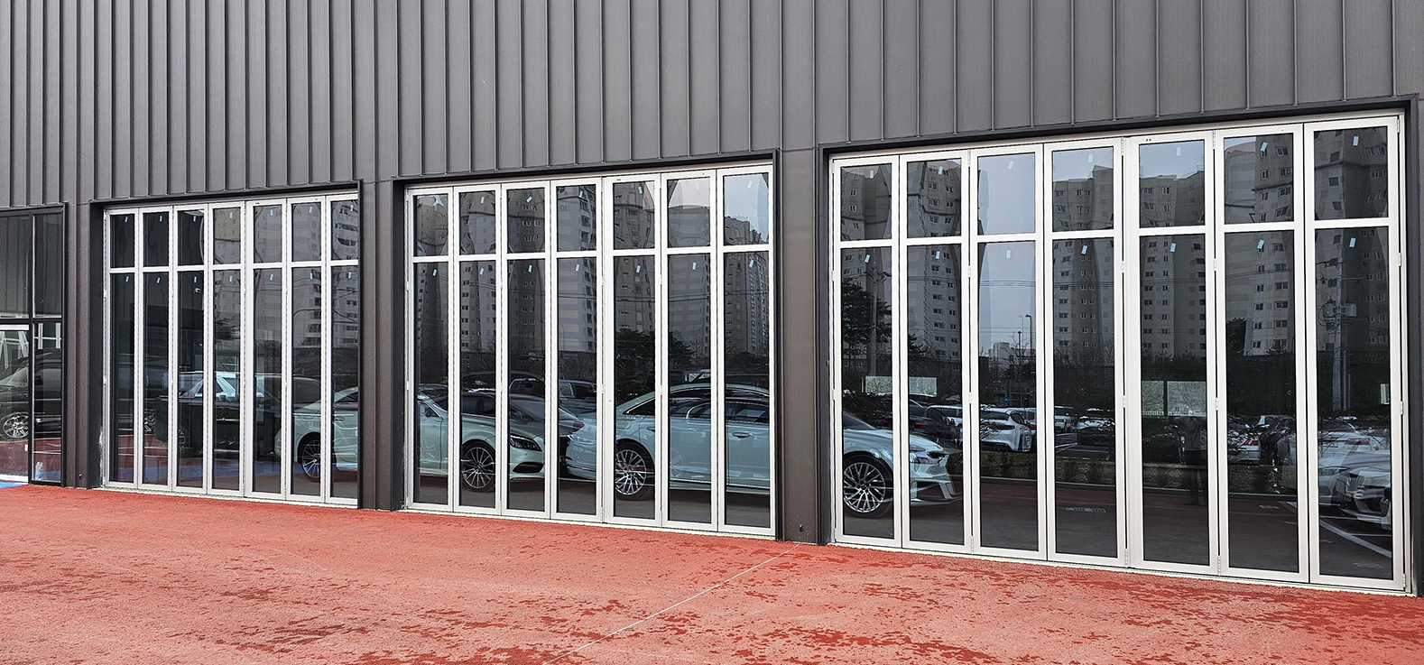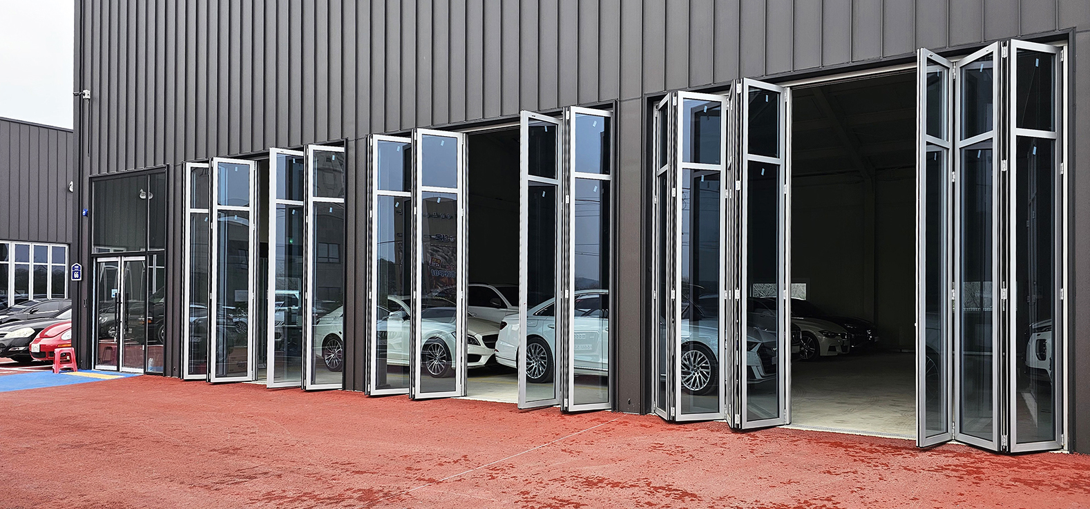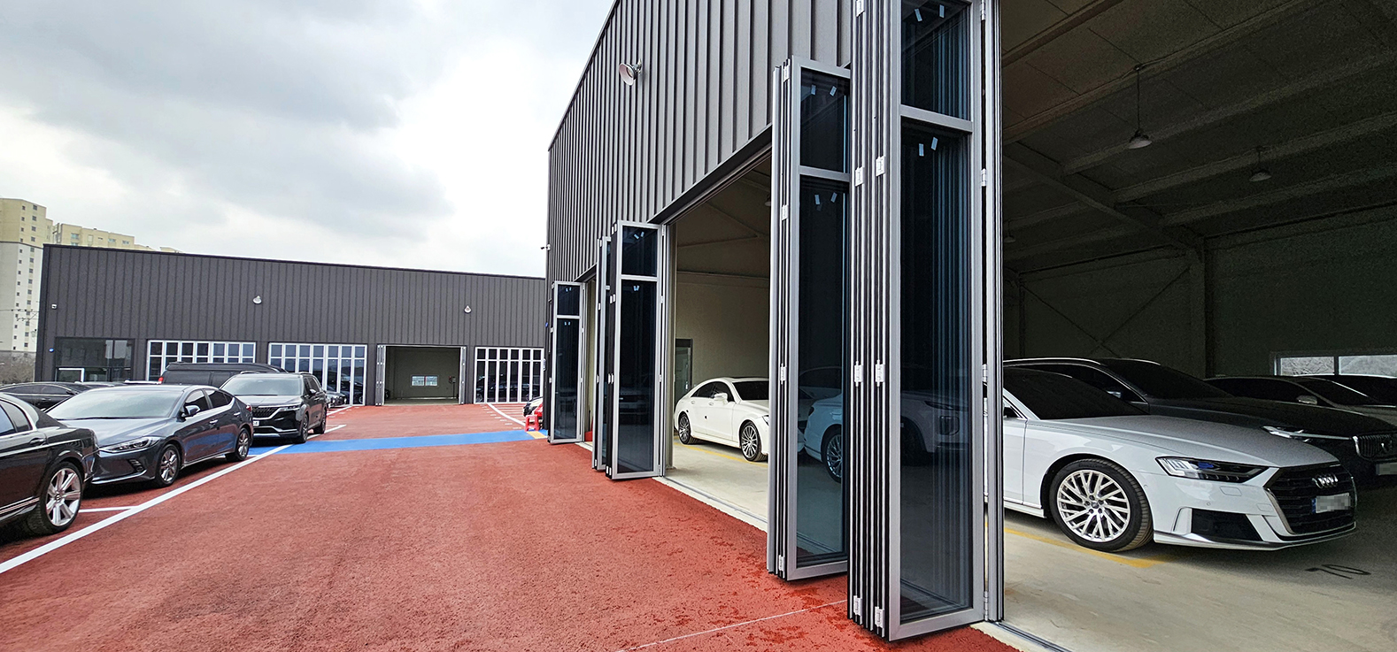 수원에 위치한 대형 중고차 매매 단지는 자동차 관련 업종 특성상 실내와 외부의 수시 출입이 이루어지므로, 일반적인 도어 설치는 실용적이지 않습니다. 이러한 요구에 맞추어 폴딩도어를 설치하여 자동차가 자유롭게 출입할 수 있도록 하였습니다. 폴딩도어는 전면 개폐가 가능해, 차량 출입 시에는 도어를 접어 공간을 넓게 활용할 수 있습니다.