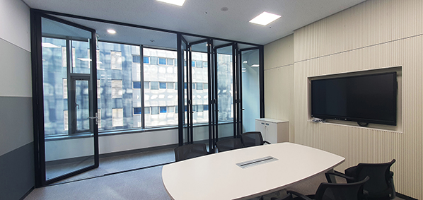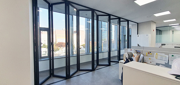 서울 강서구 등촌동의 새로운 랜드마크가 될 "NH서울타워"의 3, 4층 현장입니다. 3~4층 서울 축협의 사무실로 전체 총 50틀 270여장의 폴딩도어와 모티스락 경첩도어가 설치되었습니다. 블랙 컬러의 폴딩도어가 이중창으로 설치되어 사무실 내의 단열 뿐만 아니라 세련된 인테리어 효과까지 느껴지게 합니다.