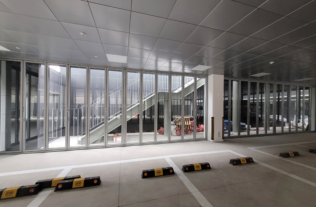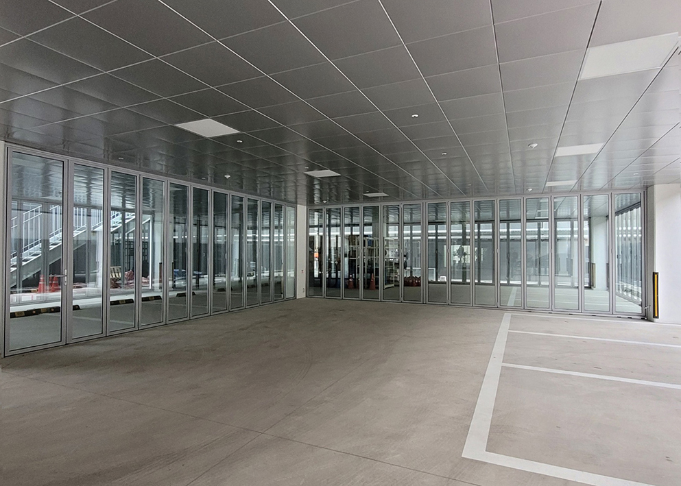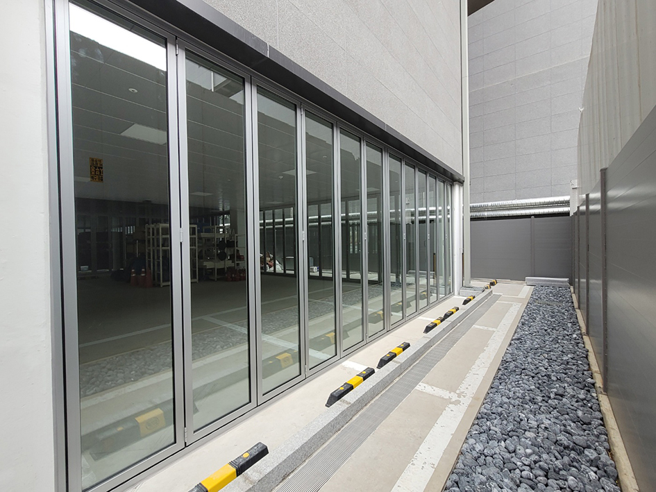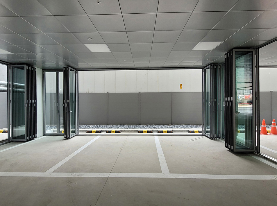 위치에 따라 일반형 레일과 차량이 지나가는 곳은 카센터형 레일을 설치하여 총 8틀 92장의 폴딩도어를 설치하였습니다.
