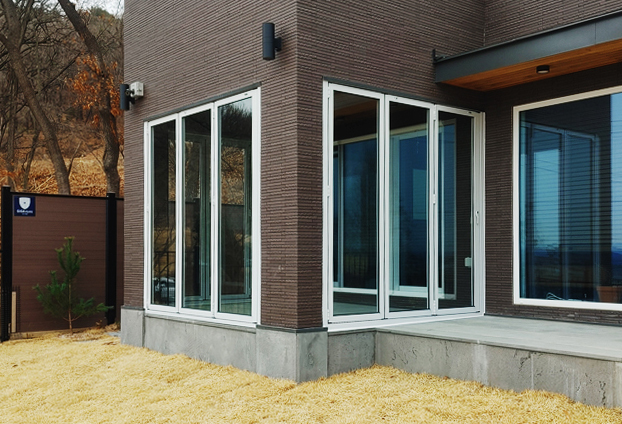 폴딩도어 하나로 더욱 고급진 주택의 모습으로 업그레이드 되었습니다. 폴딩도어 시공 전에는 텅빈 느낌으로 바로 집안 내부가 보여지는 것이 걱정이셨던 부분이, 폴딩도어 설치 후 가린듯 안가린듯 한 프라이빗한 느낌에 사생활 보호도 가능합니다.