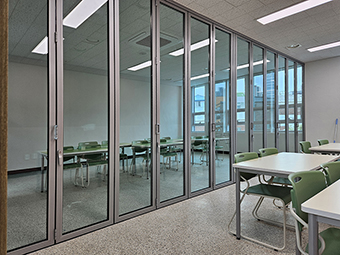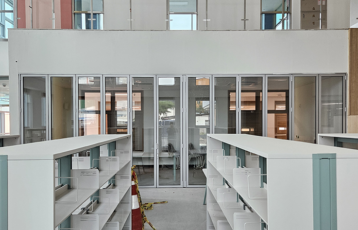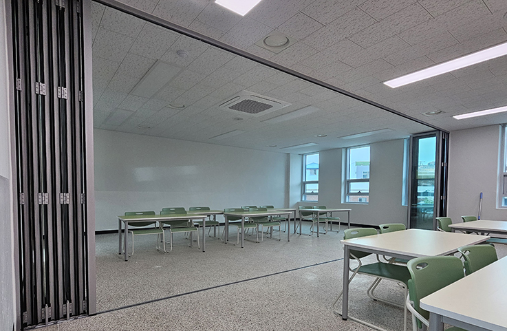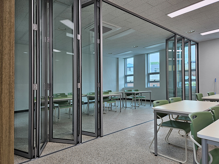 특히 강화유리 폴딩도어를 적용해 채광과 개방감을 유지하면서도 내구성을 높였으며, 낮은 단차의 하부레일 구조로 학생들의 이동 안전까지 고려하였습니다.