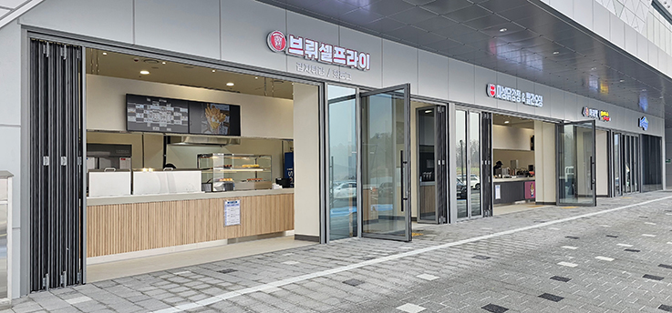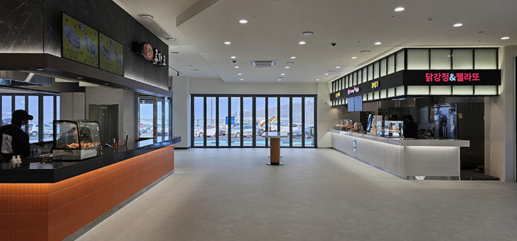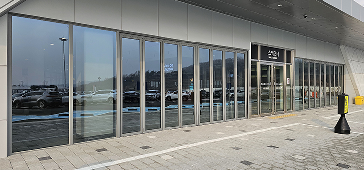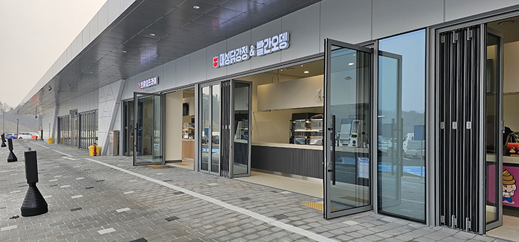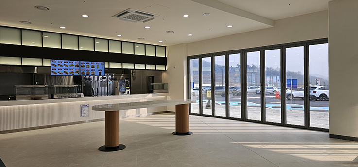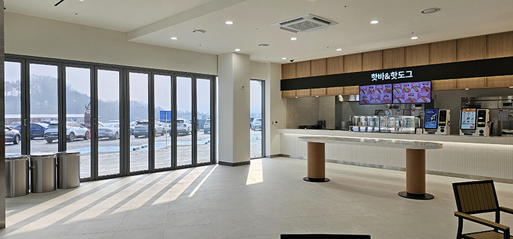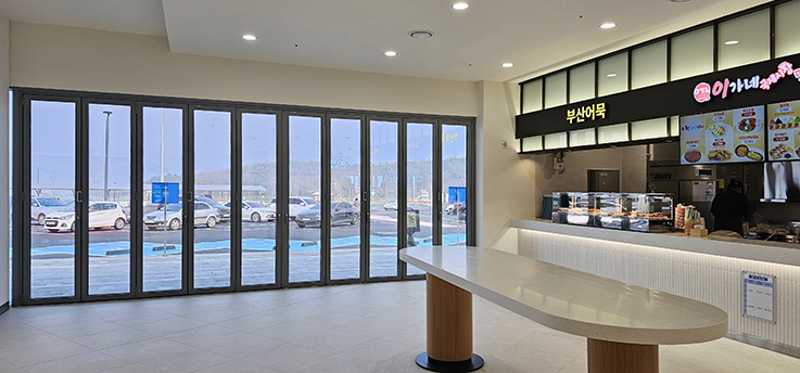 폴딩도어는 견고한 프레임과 부드러운 개폐 시스템을 적용하여 반복적인 사용에도 안정성을 유지하며, 휴게소 내부 디자인과 조화를 이루는 세련된 블랙 프레임을 사용했습니다. 그 결과, 이용객은 보다 쾌적하고 편리하게 공간을 이용할 수 있게 되었고, 휴게소의 전문적이고 깔끔한 이미지도 강화되었습니다.